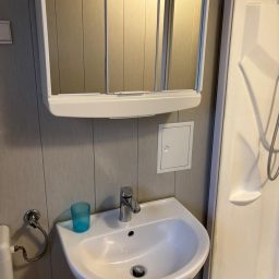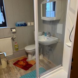 Das Badezimmer ist mit einer Dusche, einem WC sowie einem Waschbecken ausgestattet. Hand- und Duschtücher sind ebenfalls vorhanden.